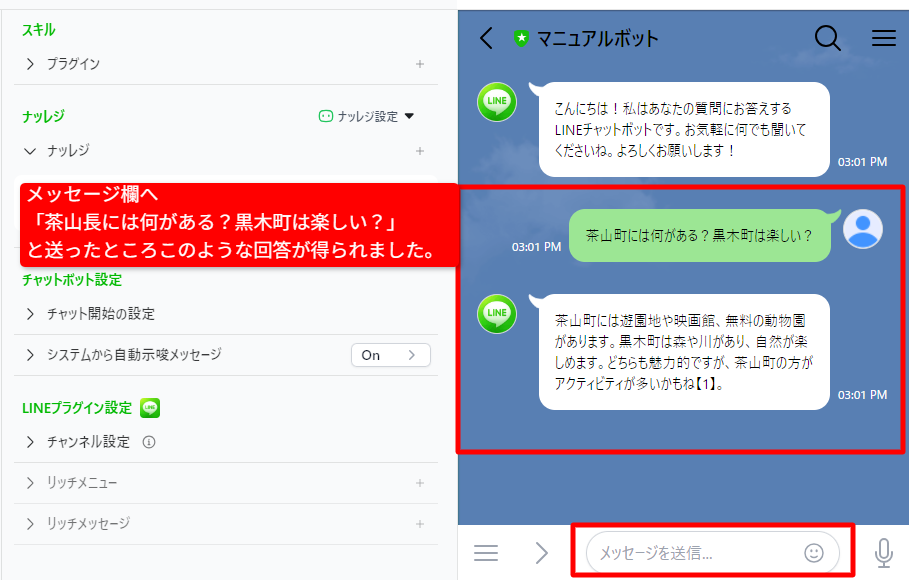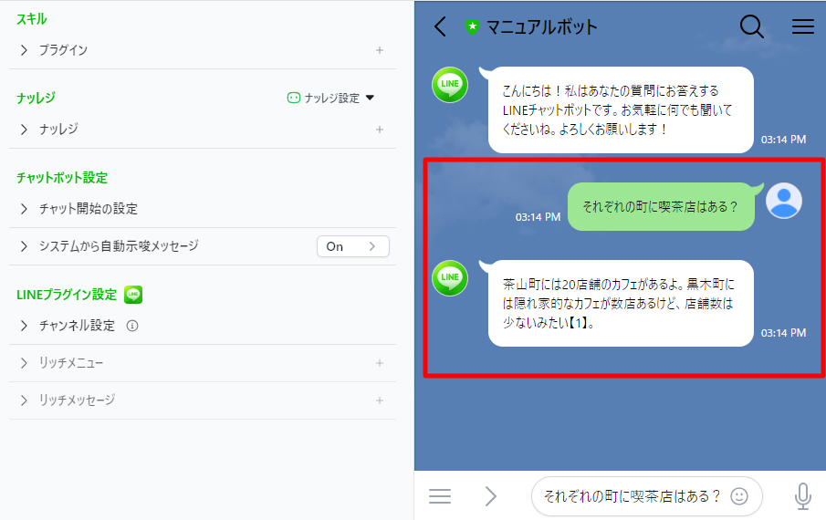 これでボットに特有の知識が追加され、自動チャットが出来るようになりました。