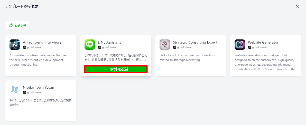 仮としてLINE Assistantにカーソルをあて、ボットを複製をクリックします。
