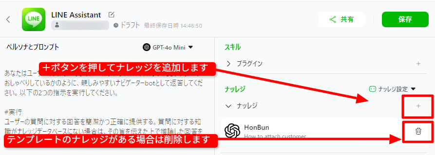 つづけてナレッジを保存し、知識を覚えさせます。