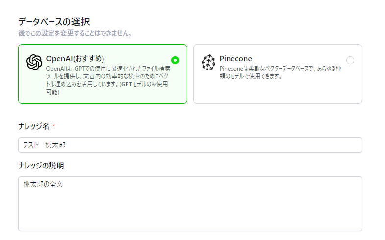 OpenAI か Pinecone か、お好みのものを選択して下さい(こちらは後程変更できません)