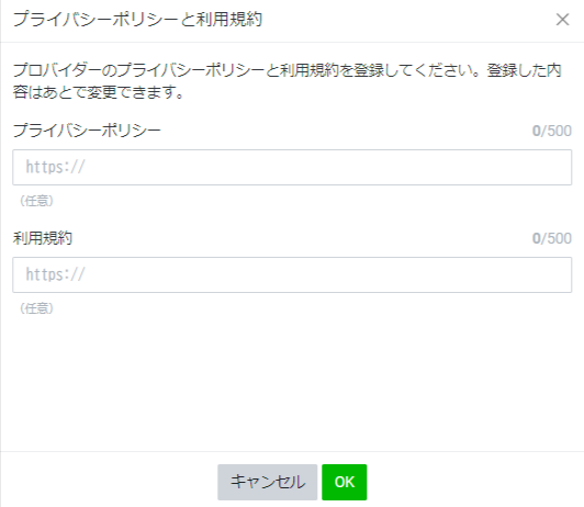 プライバシーポリシーと利用規約のURLがある場合はこちらで入力します(省略可)