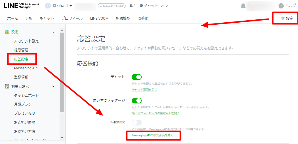 ③Webhookをオンにするために Messaging APIの設定画面を開く をクリックします。