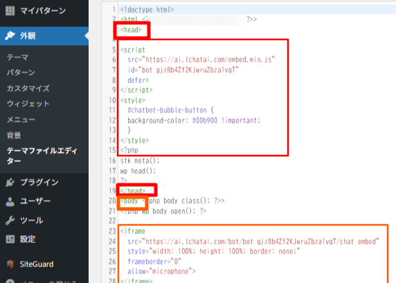 チャットを埋め込むウェブサイトの管理画面からソースコードを貼り付けます。