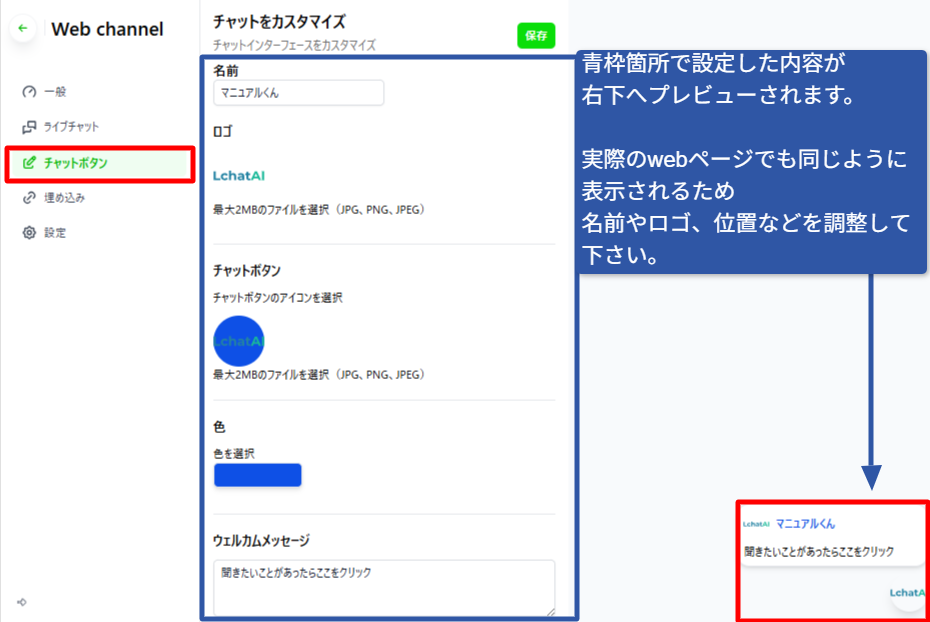 チャットボタン画面を開き、右下のプレビューを参考にボットのスタイルを設定して下さい。