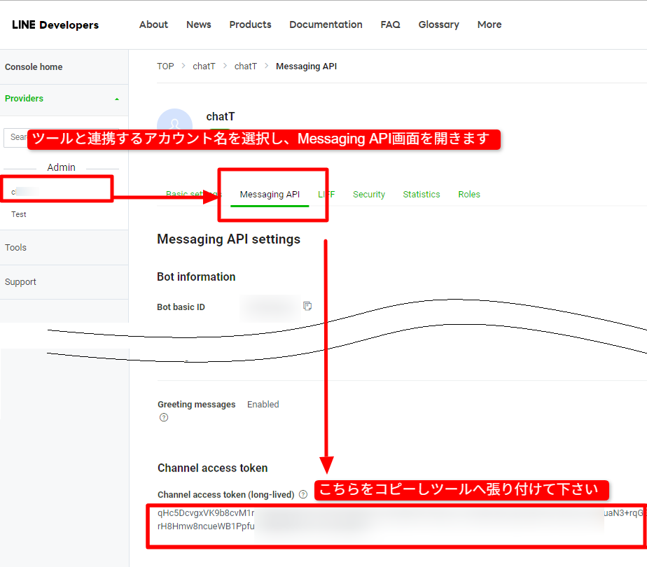 チャンネルアクセストークンの取得方法は 初期設定 を参照ください。