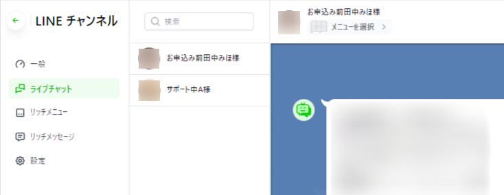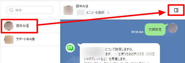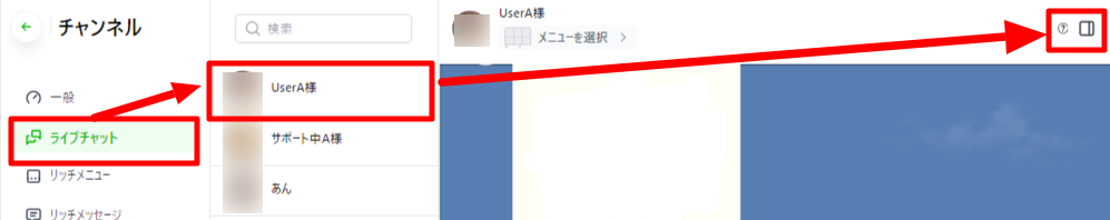 ライブチャット画面から一人のLINEユーザーを選択し、画面右のメニューを開きます。
