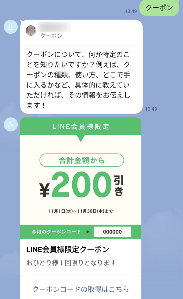 クーポン情報と同時に「クーポン」という質問に対するメッセージも送信されます。