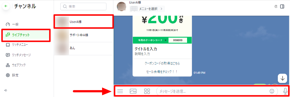 ライブチャット画面では最新のチャット状況を確認したり、LINEユーザー(顧客)の情報を変更することができます。(顧客情報はLINEへ干渉しないため、ツール内でのみ表示される情報となります)