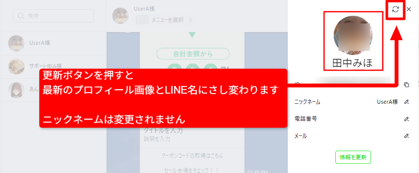 更新ボタンを押すことでLINEユーザーの名前やアイコンが最新のものへ切り替わります。