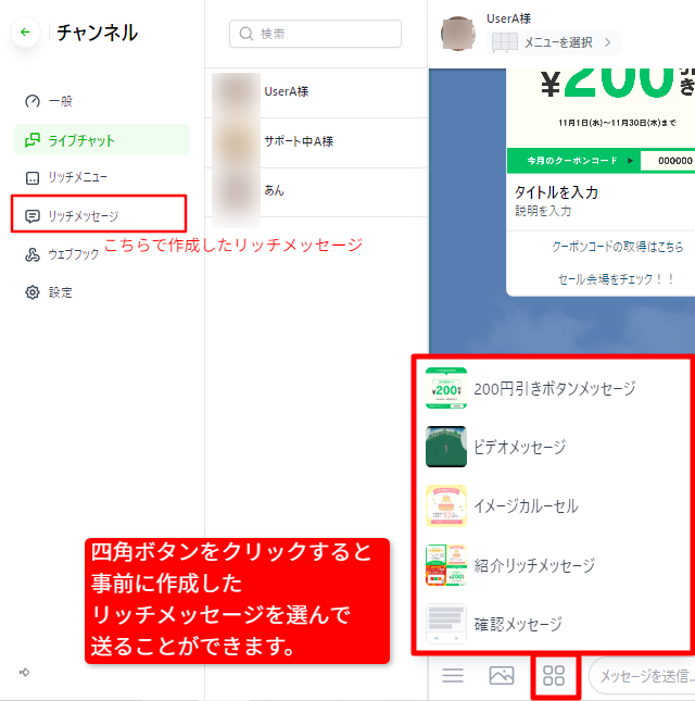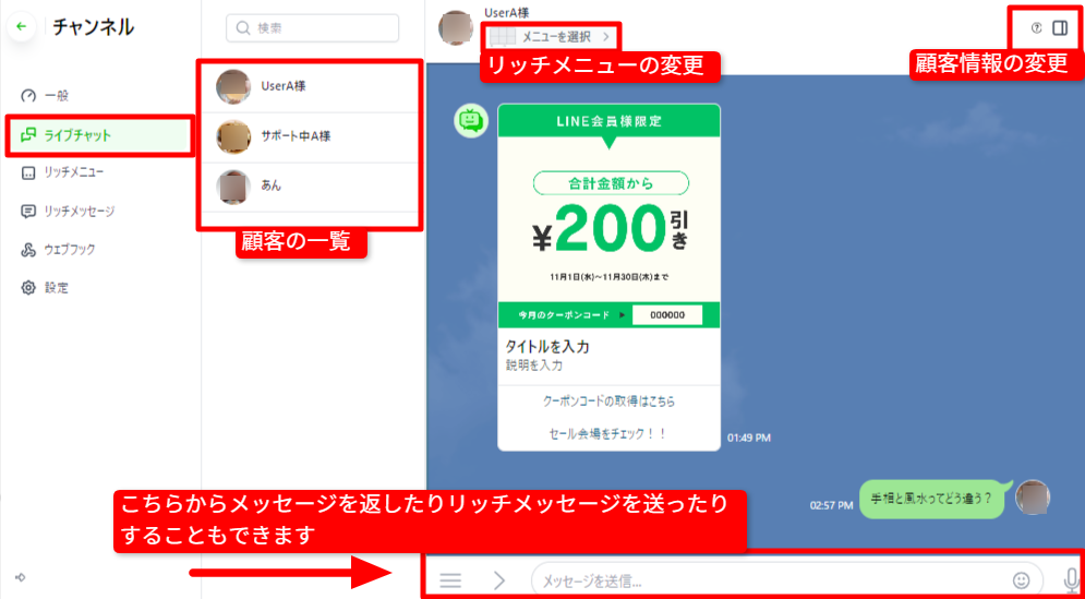 実際のチャットを確認する・お客様情報を変更する・リッチメッセージや画像を送る