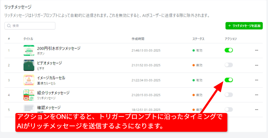リッチメッセージを送る際、AIの回答も同時に送信するか否かを設定できます。
