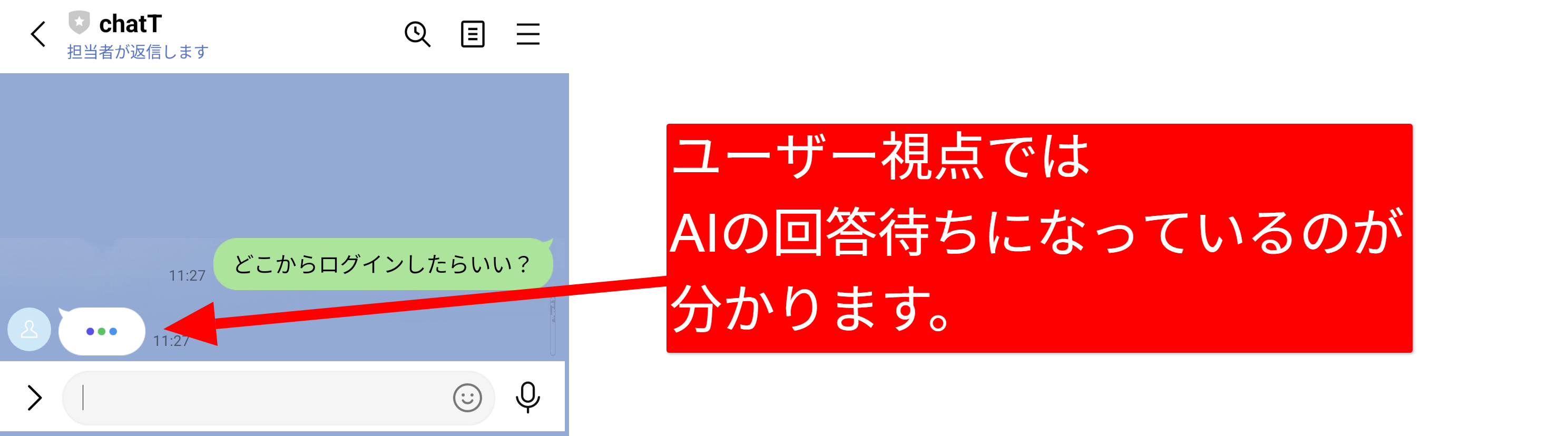 LINEユーザーがメッセージを送るとAIの回答待ち状態となりました。