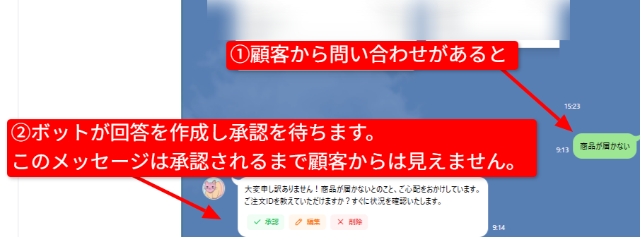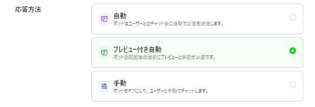 プレビュー付き自動…AIはすぐに返信せず、メッセージ送信可否の許可を待ちます。