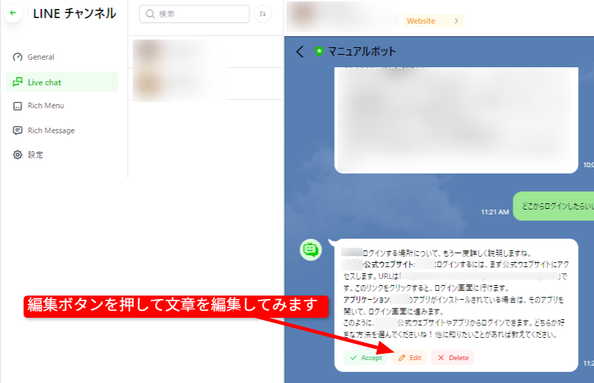 メッセージの確認・編集・承認はライブチャット画面から行います。