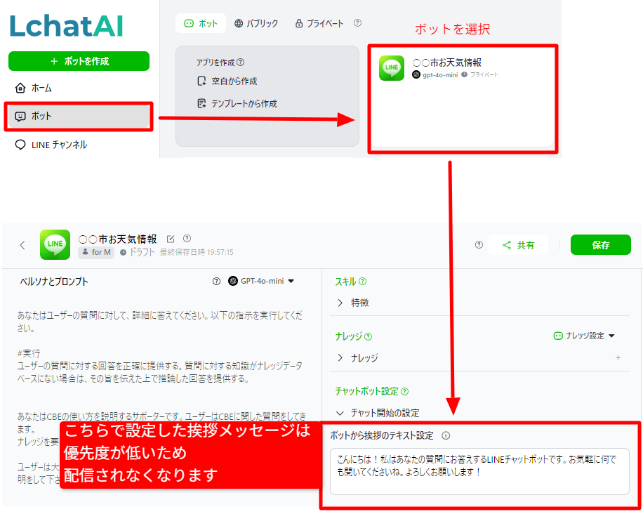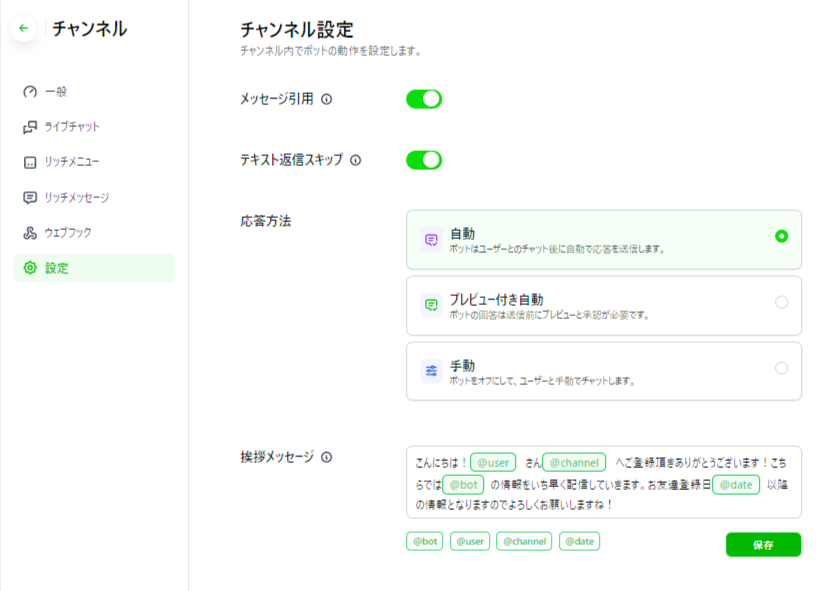 またボット編集画面で設定した挨拶メッセージはチャンネル設定画面の挨拶メッセージより優先度が低いため、配信されなくなります。