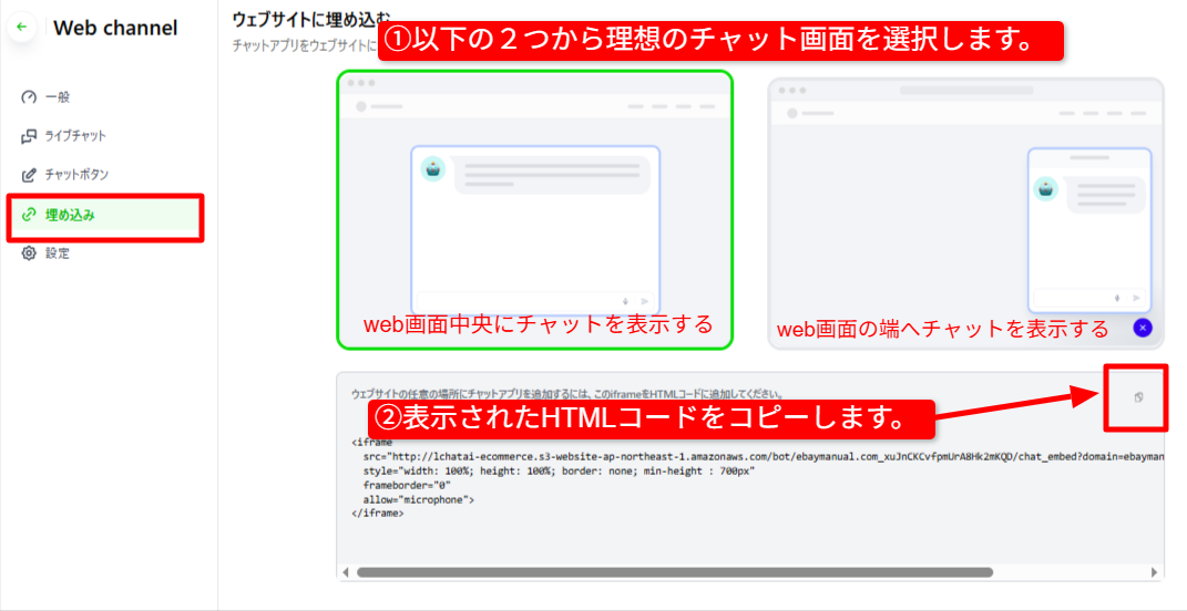 ②Webサイトへチャットを埋め込み稼働する方法を解説していきます。