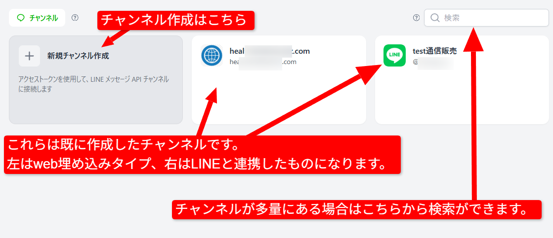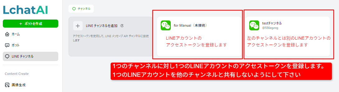 複数のチャンネルを作ることは可能ですが、その分それぞれのLINEアカウントも必要となります。それらを1つのLINEアカウントと共有し連携すると誤動作を起こしますのでご注意下さい。