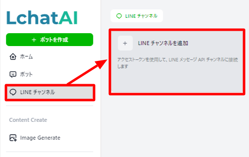 メニューからLINEチャンネルを選び、LINEチャンネルを追加を選択します。