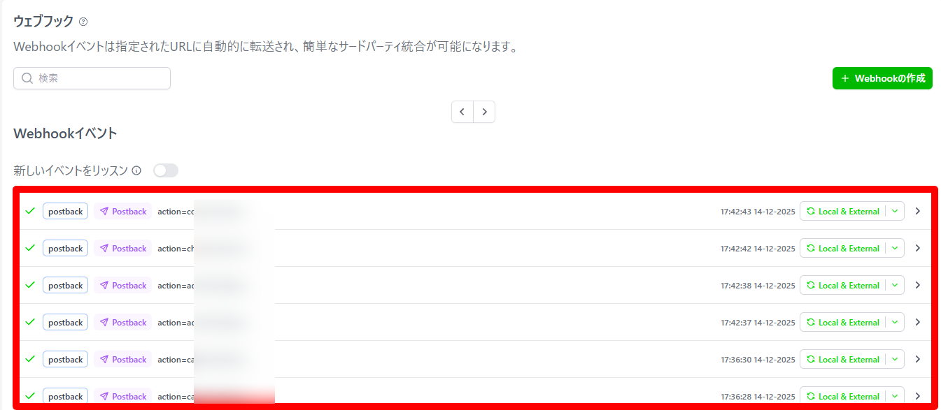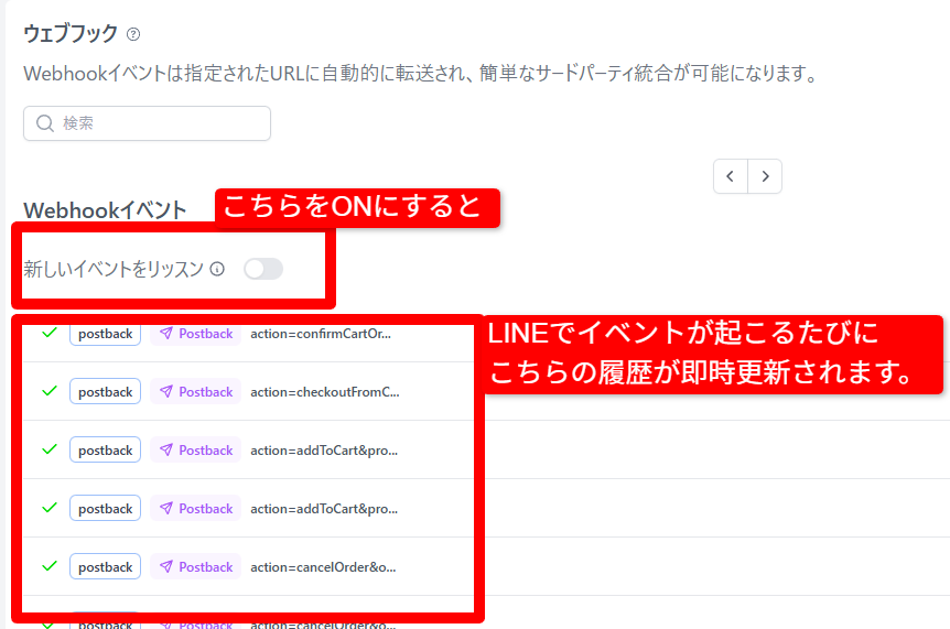 「新しいイベントのリッスン」とは、Webhookイベントをリアルタイムで画面に表示するための表示用機能です。