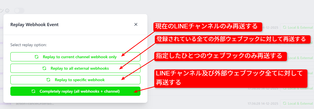 - 登録されている外部のウェブフックに対して再送する