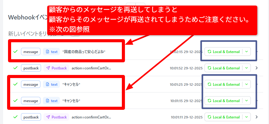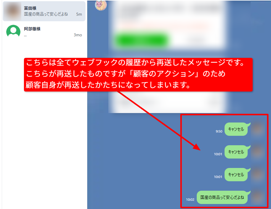 上記の青枠をクリックしてしまうと下図のように顧客側からメッセージが再送されてしまいます。