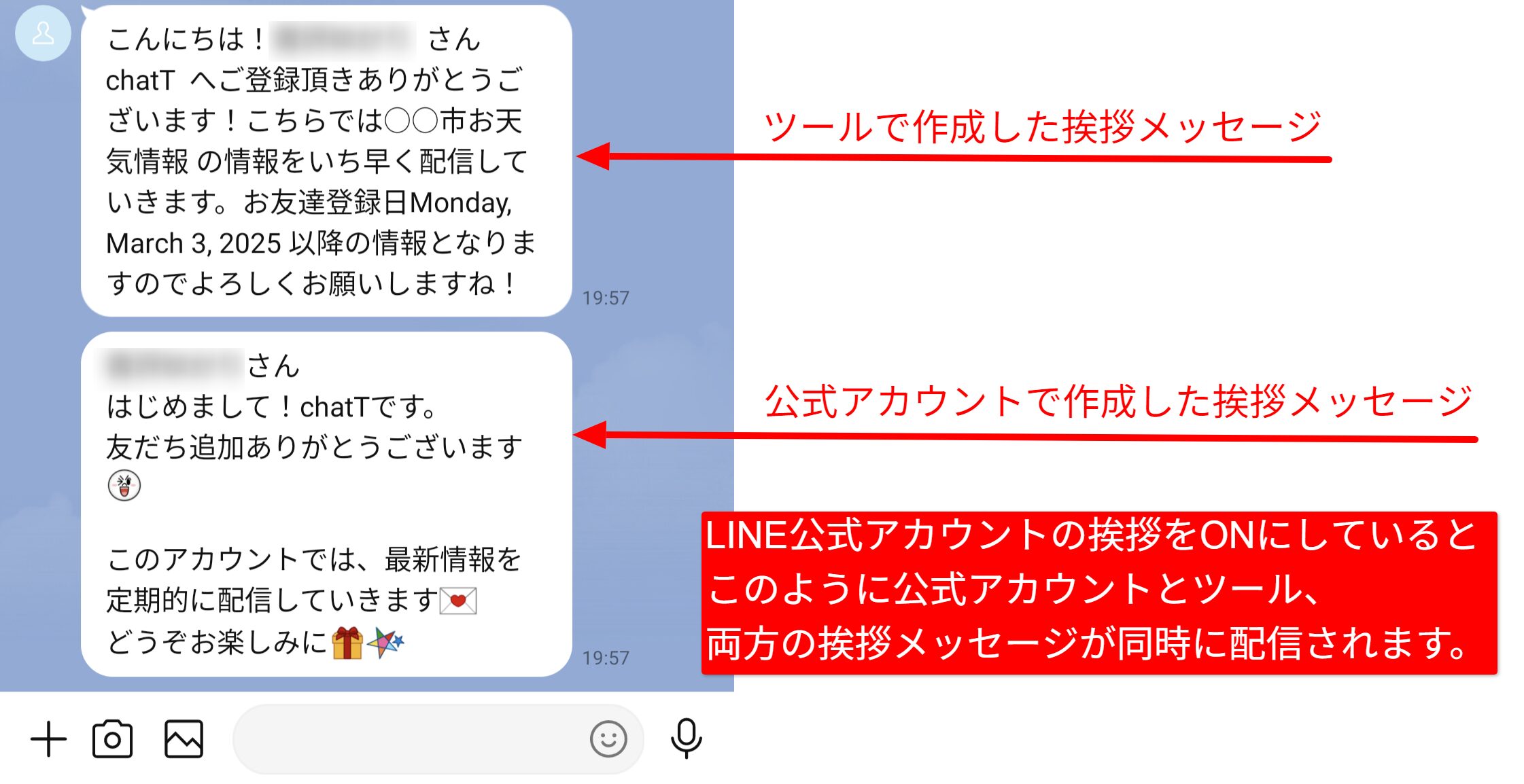 こちらの挨拶メッセージはLINE公式アカウントの挨拶と同時に配信されるため、不要であればLINE公式アカウントの挨拶はOFFにして下さい。