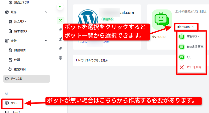 画面右側のボットを選択をクリックしボットを選んでください。
