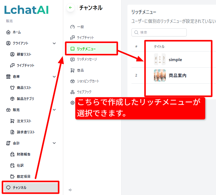 下の画像では予め作成した simple、商品案内、という2種類のリッチメニューのうち