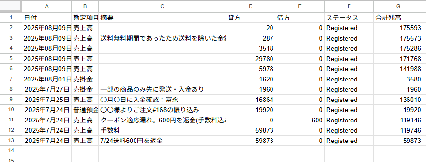 | キャッシュフロー | 日々の入出金の履歴が表示されます。勘定科目ごとに「借方/貸方」どちらに分類されるかを確認でき、取引メモも一覧表示されます。現金の動きの把握に役立ちます。 |