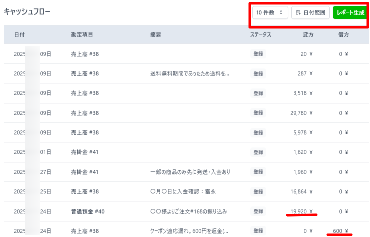 こちらでは日々の入出金の履歴が表示されます。勘定科目ごとに「借方/貸方」どちらに分類されるかを確認できます。また画面右上から表示件数、日付範囲、レポート生成が可能です。