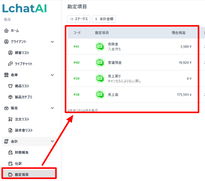 こちらで表示されている勘定科目は左メニューの勘定科目から作成されたものです。