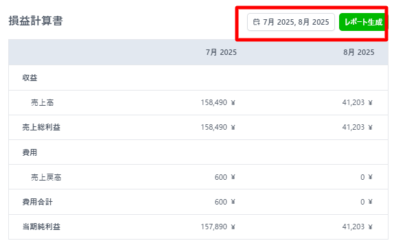 登録された売上・費用に基づき、売上高・売上総利益・費用合計・当期純利益を月単位または期間指定で表示します。月単位で範囲の指定、レポート生成が可能です。