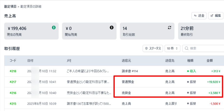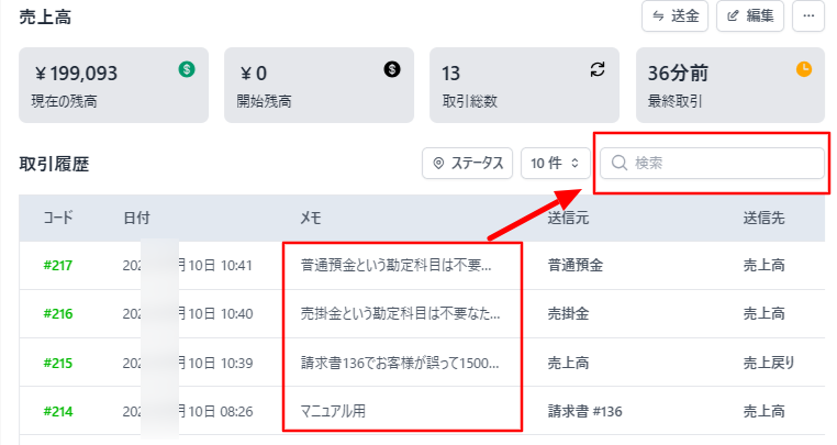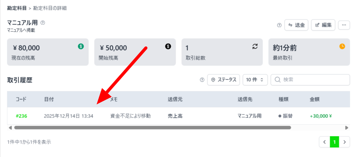 送金履歴は勘定科目詳細画面にも記録されます。