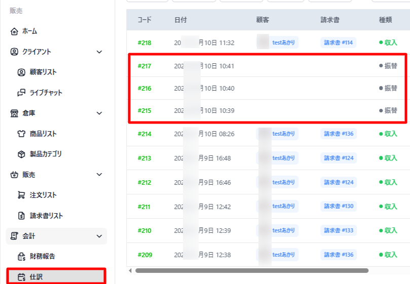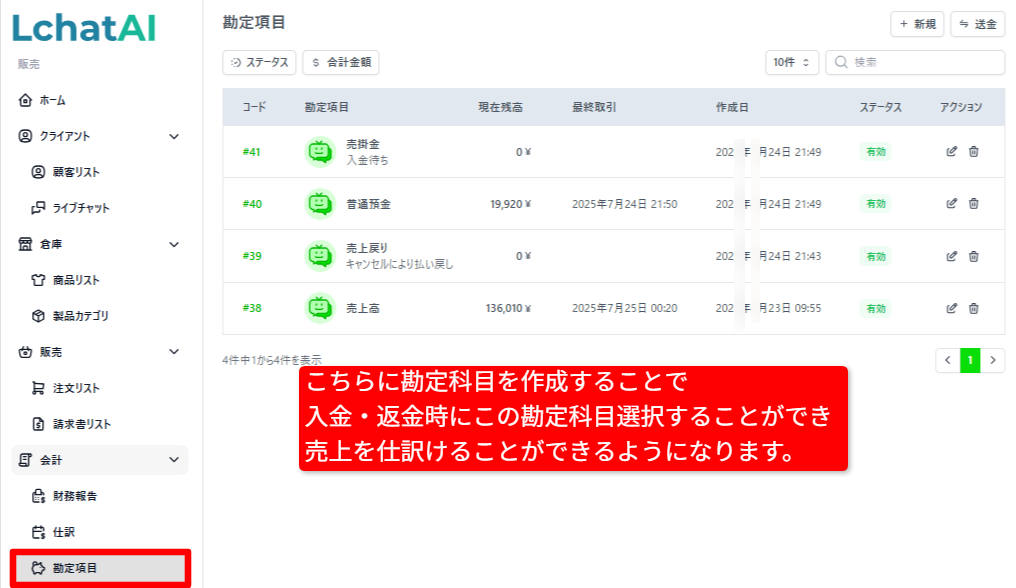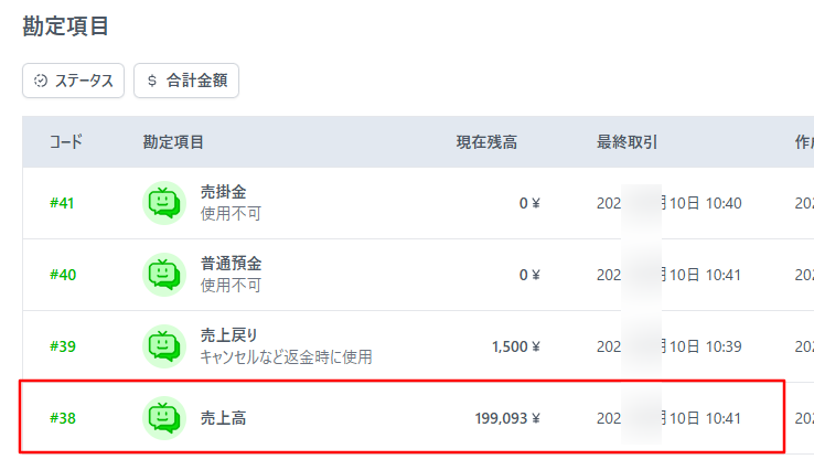 こちらで勘定科目を作成しておくと、顧客から受け取った売り上げを登録できるようになります。