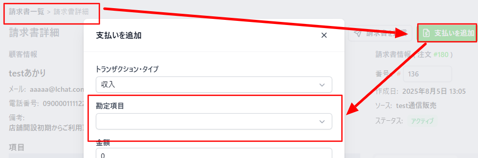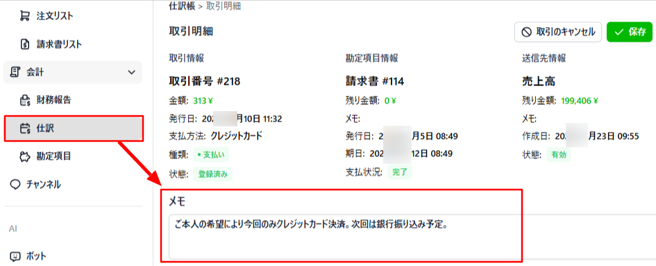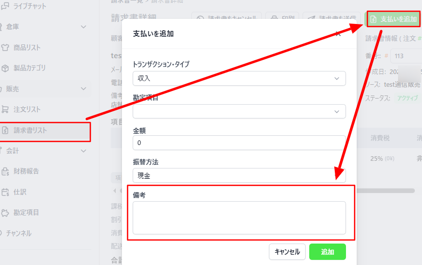 1.請求書画面から入金・返金を登録するときにメモを登録できます。