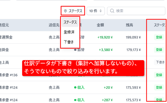 勘定科目仕訳履歴からステータス 登録or下書きをもとに絞り込みを行います。