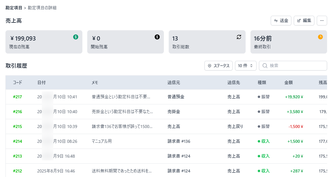 画面右上より勘定科目の履歴の絞り込みや検索、勘定科目間の送金、勘定科目の編集が行えます。
