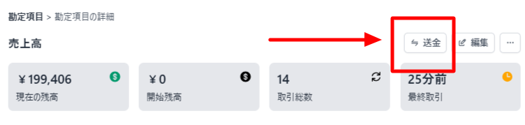 勘定科目間で送金を行う(残高を変更する)には画面右上の送金ボタンをクリックします。