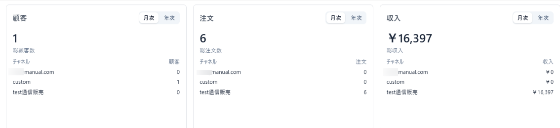 こちらでは月次表示を選択しているため、今月の新規顧客は一人、今月の注文数合計は6件、