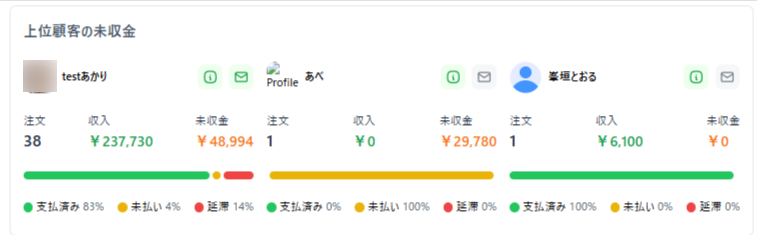 上記の例ですとtestあかりさんは38件の注文、237,730円の支払いはあるものの未払いが48,994円あります。そのうち支払い期間をオーバーしてしまっているものが14%(38,894円)あります。